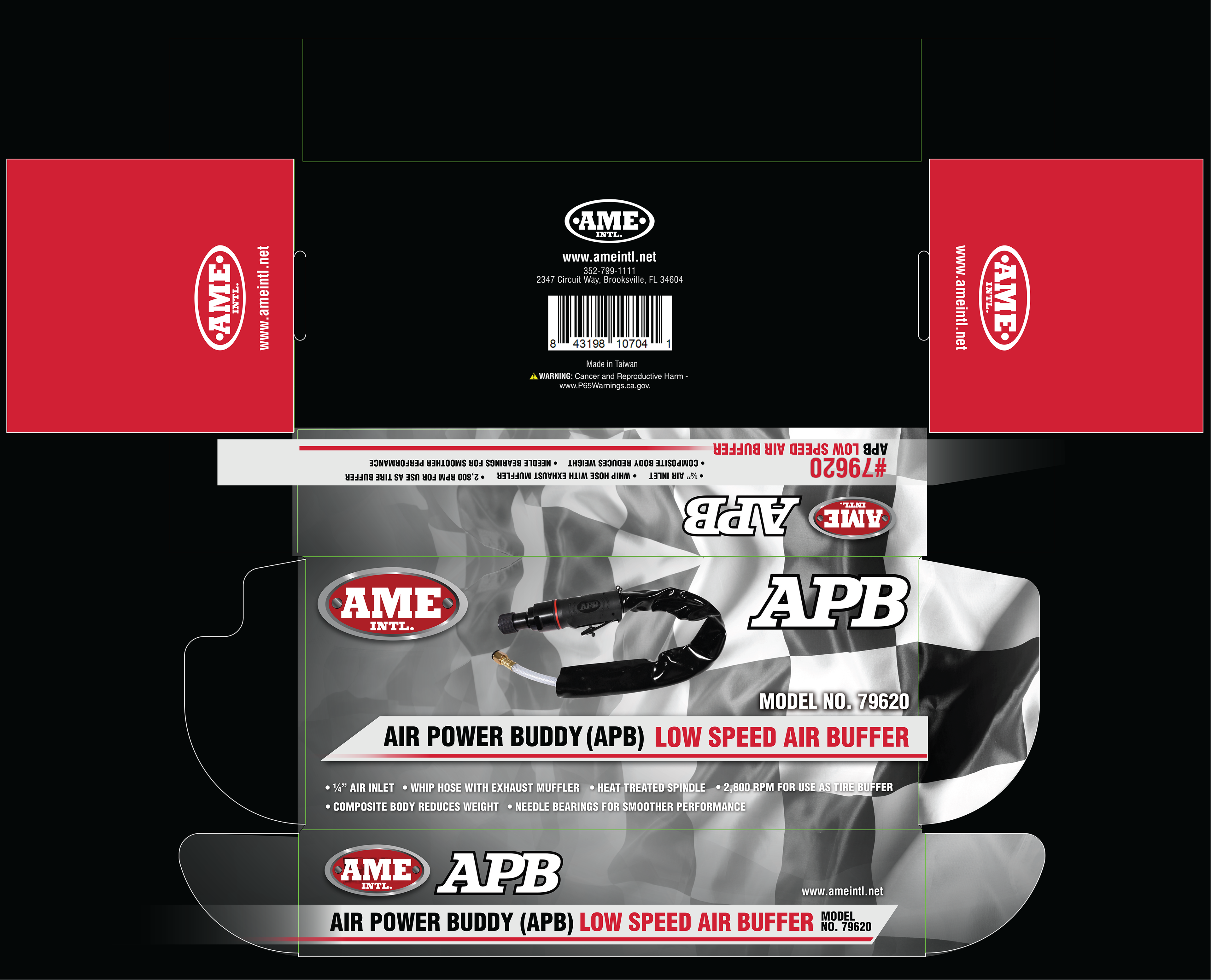 The design is somewhat simple but contains straightforward information, and enough features and benefits listed to help the user understand the overall basics of the tool. The checkered flag helps to reinforce the automotive theme, while the black and white background creates great contrast with the colorful red AME logo. The solid red sides with the one-color logo help call to the AME International brand at a glance if product were to be stored on a shelf.